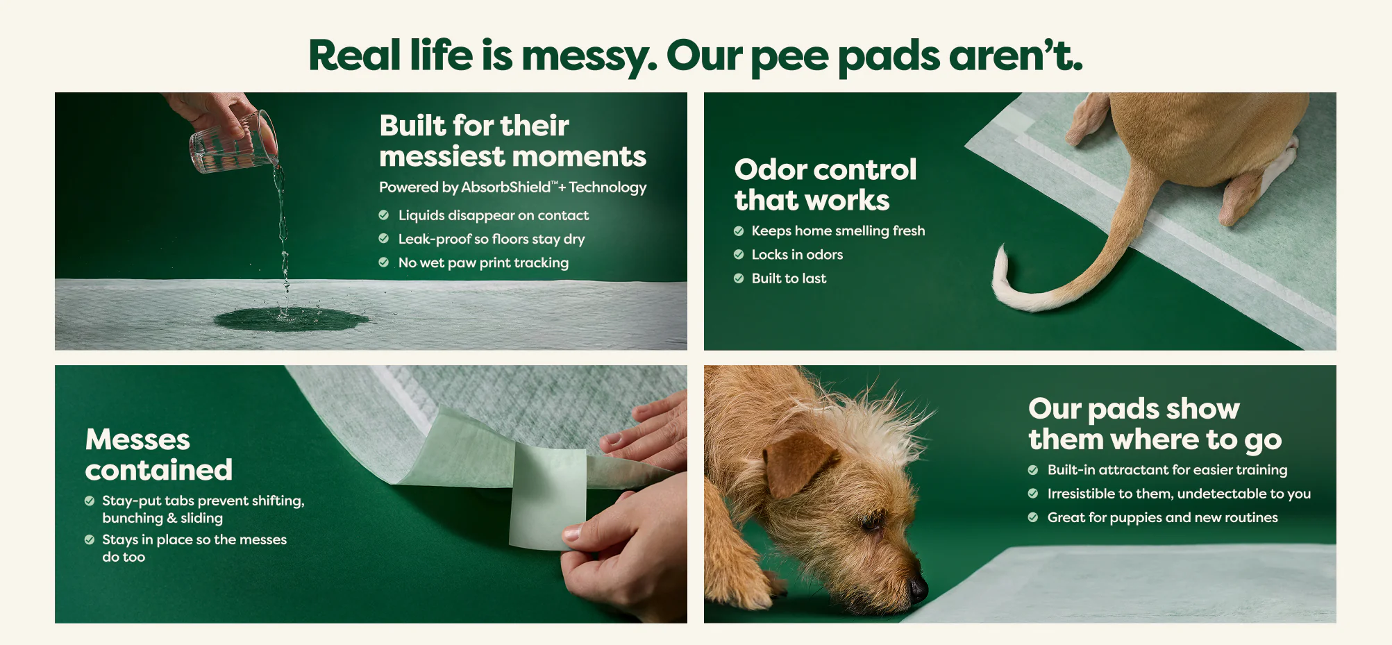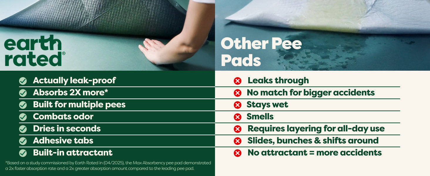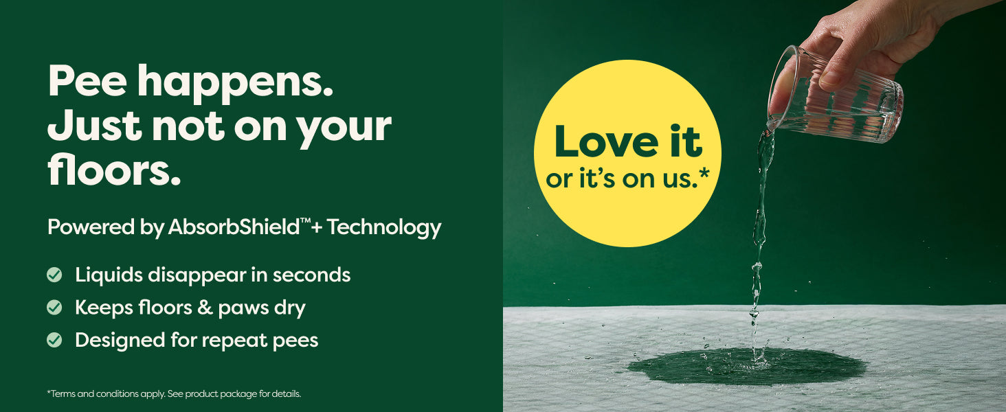 Our pee pads, engineered with AbsorbShield™+ Technology, soak up life's messes 2X faster* than the leading pee pad reducing the risk of tracking pee off the pad.